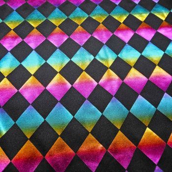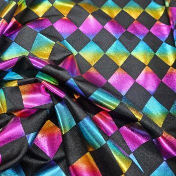 Shiny gradient multi-colour foil overlay in a diamond/harleqiun pattern interchanging between the foil and black nylon spandex base.